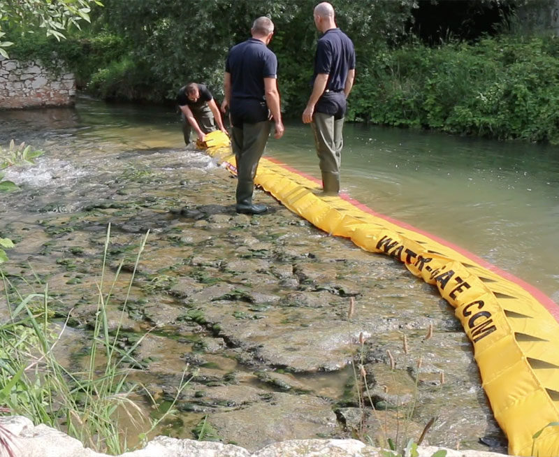 - De voorrand van de bouwkuip moet in principe hoger zijn dan de bovenstroomse zijde van de drempel. We ballasteren de voorrand om te voorkomen dat de stroming het canvas optilt en vervolgens onder de kofferdam door sijpelt.